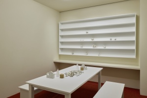 mend Piece 1966 table, benches, shelves, tape, twine, scissors, glue, white ceramics damaged from the 2024 Noto Peninsula earthquake, artist's instruction Dimensions variable 11 versions ©Yoko Ono -