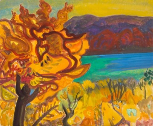 自動車を運転しなかった古橋は、いくつかの旅行以外、その対象は自分の足で歩いていける日光の山々の自然でした。実際の風景をモチーフとしながらも、自在に風景を画面の中で構築していく様は、視覚だけではなく、その空気も肌で捉えているようなリアリティを持ち、見る人に絵の豊かさを感じさせます。絵に描かれた木や山々のとても魅力的な形体と瑞々しい色彩が、とても現代的に感じられるのです。