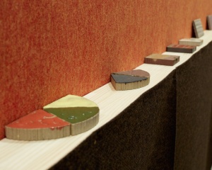 それはいわゆる「インスタレーション」とも違い、一つの作品にはそれぞれ独自の「空間」が構成され、作品と作品、作品と私たちのいる展示空間の間には、杉戸洋という作家の思考と入念なリサーチ、プロセス、時間、そして色彩と余白が幾十にも重なり合わされて、作品空間全体からまるで豊かな音楽のリズムや旋律が聴こえるかのようです。