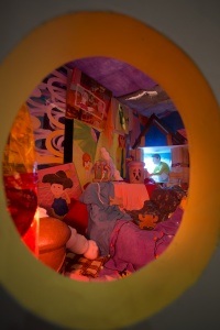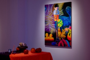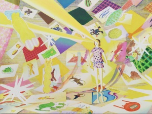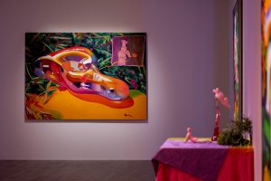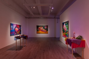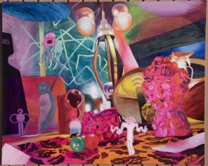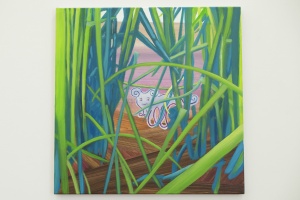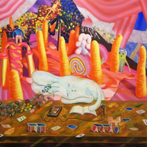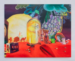 Another notable feature of Ito’s work is her production process. Ito physically constructs worlds of chaos, which she then photographs—her finished paintings in essence being realistic depictions of these compositions. She creates character-like entities, and combines them with miscellaneous items such as fabric, plants, toys, and cellophane to create a diorama, then takes numerous photographs and selects a specific image from which to produce a faithful rendition on canvas. The way she enhances the precision of her work through this painstaking process could be perceived as an experiment that aims to discover surprise and joy beyond imagination. Recent collaborations including her two-person show with Richard Gorman, as well as projects with The Essential Store and the Fujimura Family have also enabled her to generate a sense of exuberance through encounters with other talents.