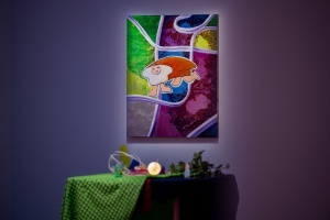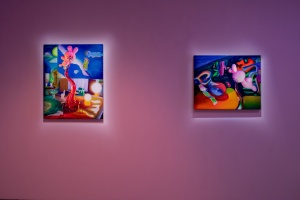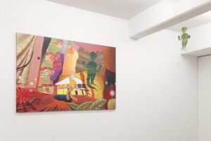 With their maelstrom of dark vibrant colors such as orange, red, green, purple, and yellow reminiscent of artificial neon, remarkably composed backdrops where time and space appear distorted, and aloof figures or objects that are enlarged, minimized, or seem suspended in mid-air—Ito’s works instill viewers with a peculiar sensation, as if peering into a languid and weightless space.
