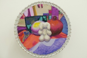 Mikado-chan meets River imp 2017 oil on canvas stretched by cage φ28.5 cm ©︎Aya Ito photo by Sachiko Abe -