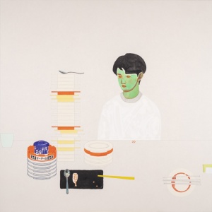 スシローにて At Sushiro 2023 acrylic, watercolor, pencil, watercolor pencil and ink on paper mounted on wood panel 121.0 x 121.0 cm ©Masako Ando -