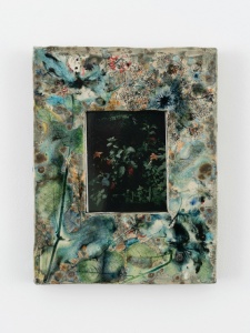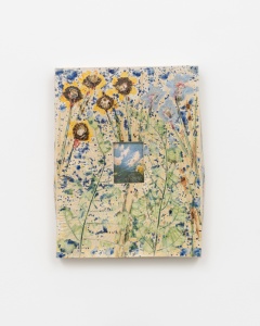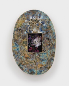 Sam Falls サム・フォールズ Drape the dust of this world in droplets of dew 2023 Fujifilm FP-100C45 instant film, glazed ceramic and glass 39.1 x 29.8 x 6 cm ©Sam Falls -