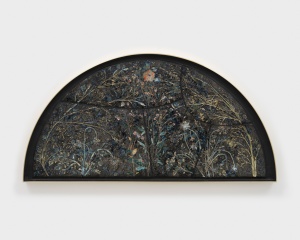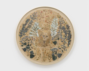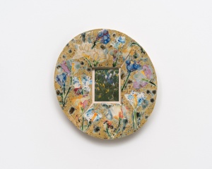 Live Forever 2023 φ90.0 cm/h.90.0 x w.90.0 x d.11.6 cm Glazed ceramic and glass, brass frame ©Sam Falls -