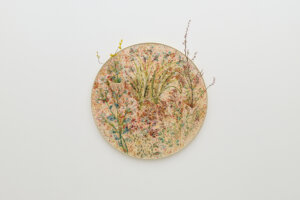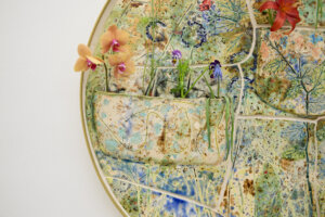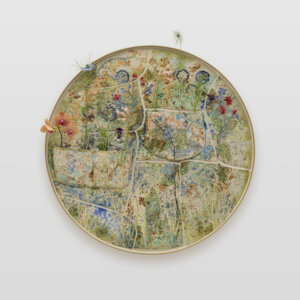 Sam Falls サム・フォールズ Spring Flowers, Autumn Moon (春花秋月, Shunkashūgetsu) glazed ceramic with glass in brass frame, flowers, water φ 83.2 x d. 6.8 cm ©︎Sam Falls -