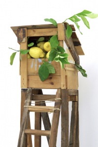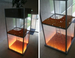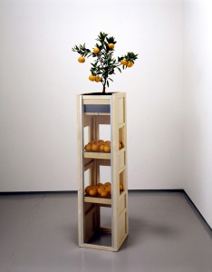 Torre della furtta (fruit tower) 2004 wood, glass, aluminum, orange and plant h.32.5 × w.32.5 × d.150.0 cm ©Satoshi Hirose -