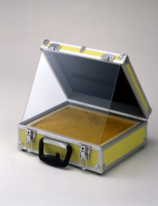 Casa del turmeric/ giallo (Turmeric house/ yellow) 2004 wood, bag, glass and turmeric h.32.0 × w.34.0 × d.34.5 cm ©Satoshi Hirose -