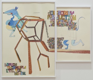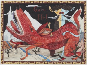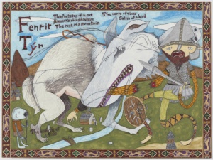 Fenrir and Týr 2013 pencil, color pencil, acrylic, collage on paper 44.5 × 69.8 cm ©Shintaro Miyake -