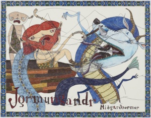 Pórr & Jörmungandr 2013 pencil, color pencil, acrylic, collage on paper 43.7 × 56.3 cm ©Shintaro Miyake -