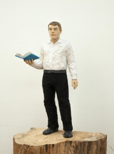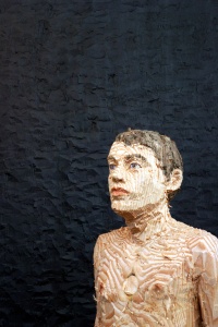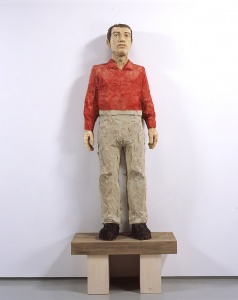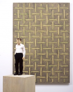 • man in white shirt and a woven relief 2007 douglas fir, wawa wood, painted