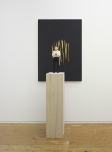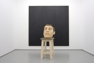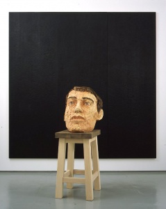 • big head with 3 part-relief (black) 2007 beech wood, wawa wood, painted with pedestal (pine wood)
