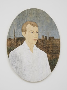 • Mann mit weißem Hemd (Man in White Shirt: Industry) 白いシャツの男(工業地帯) 2019 Relief made of Wawa-Wood Fumigated with expertise Painted & colored h.127.0 × w.93.5 × d.4.0 cm ©Stephan Balkenhol