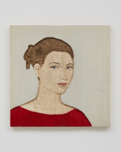 • Frau mit rotem Hemd (Woman in Red Shirt) 赤いシャツの女 2019 Relief made of Wawa-Wood Fumigated with expertise Painted & colored h.50 × w.50 × d.4.4 cm ©Stephan Balkenhol