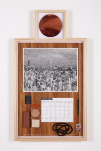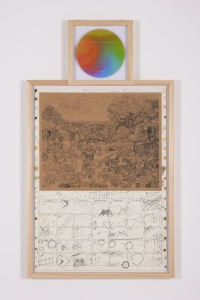 Drawing: Amedeo Clemente Modigliani’s Studio - November with LP Record Music by Riki Eric Hidaka: 1.Music for Amedeo Clemente Modigliani, November and Toru Kuwakubo 2019 image: 120.0 x 82.0 x 2.4 cm / frame: 165.5 x 91.5 x 13.0 cm charcoal, paper, brick, terra cotta, pen, chisel, cord and eye shadow palette on panel ©︎Toru Kuwakubo -