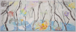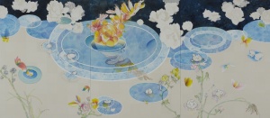 • 秘密は籠の中で貪婪の水を吸う The secret sucks avaricious water in a cage 2011 water color, lithograph ink, chinese ink, pencil 149.0 × 359.5 cm (3 pieces) ©Yuko Someya