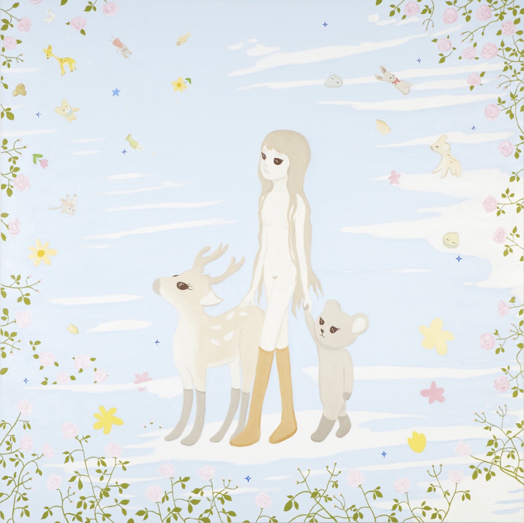 “Only in Dreams” presents recent paintings created since 2010. Kuwahara describes them with “the sense of abundant joy”. The largest painting “Shopping Mall” (2012) depicts a bright shopping mall. Kuwahara states that its background music gives an atmosphere like church, attracting people with the sense of abundant joy more than shopping. As he remarks, a girl and a humorous character holding hands in “Mirica” (2012) remind us Expulsion from Paradise. Kuwahara’s calm observation might have changed over years. This is the eighth solo exhibition with Tomio Koyama Gallery.