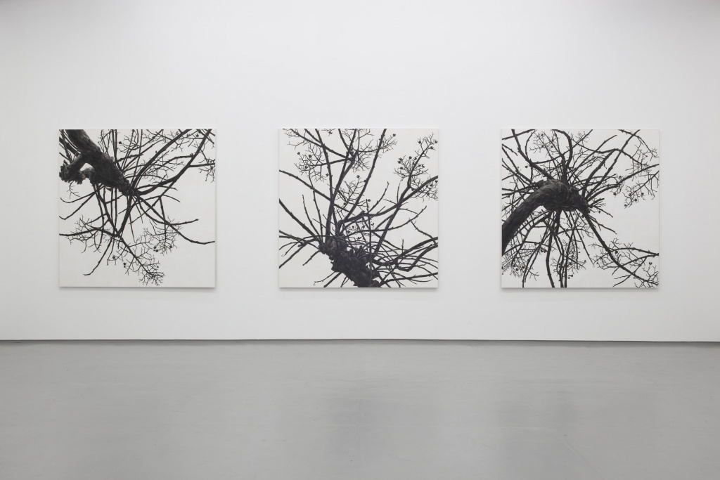 As she notes “Tree branches allow me to measure space. They are calibrations that divide space.” (Rieko Hidaka “Notes on Distance from the Sky”, gFAL, published by Musashino Art University, 2008, Translated by Charles Worthen), the pure white space that spreads in between the wide branches on a picture plane evokes the distance that the artist describes, ”The more I look, the clearer unfathomable distance becomes”. As “The feeling of distance I perceive and want to record on the picture plane differs from that of traditional aerial-perspective representation”, the artist captures only the tree branches and leaves that can be seen with her own eyes. She omits the expressions on the surface of the trees and focuses on the elements she chooses.