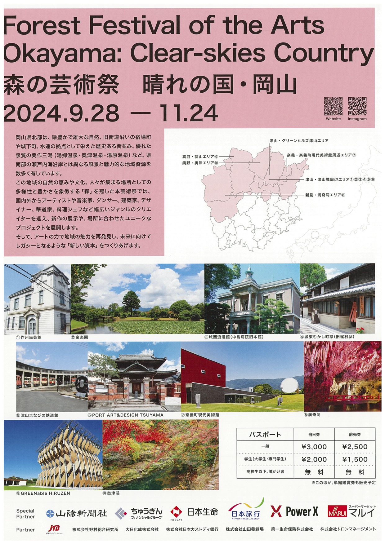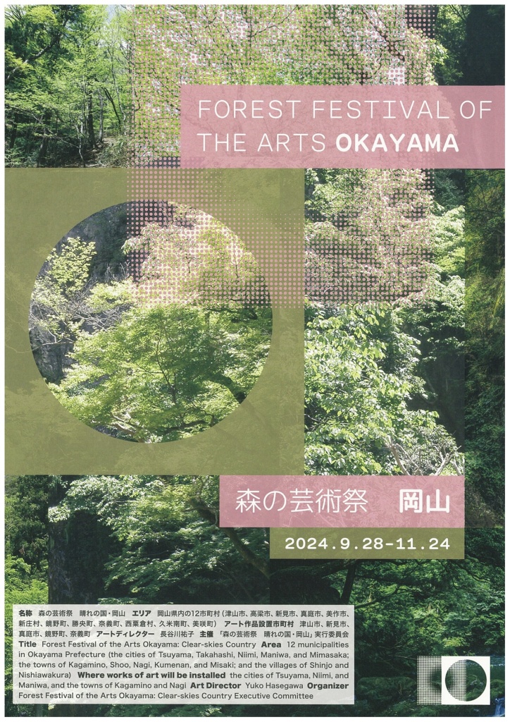 “Forest Festival of the Arts Okayama: Clear-skies Country” 12 municipalities in Okayama Prefecture (the cities of Tsuyama, Takahashi, Niimi, Maniwa, and Mimasaka; the towns of Kagamino, Shoo, Nagi, Kumenan, and Misaki; and the villages of Shinjo and Nishiawakura), Japan