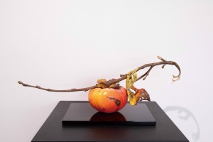 The persimmon motif in his work Kaki (Persimmon) is so surprisingly delicate and realistic that one finds it hard to believe it is a wood carving at first glance. According to Iwasaki, however, it is a physical manifestation of a mental image that he has. In his hometown of Inami, there are lots of persimmon trees, but when they bear fruit, no one takes them. The persimmons turn a deep orange color, snow piles up, and then they rot and fall to the ground. For Iwasaki, this is a kind of originary landscape for the artist, and the work itself can be traced to a kind of nostalgic yearning for this scene.