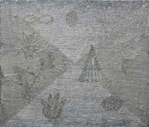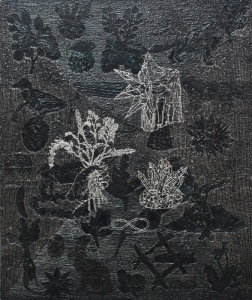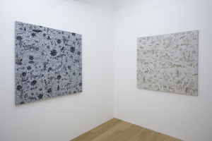 Visual effects of Funo’s layered pictorial space – meticulous brushstrokes of acrylic paint with a depth that recalls pointillism or textiles woven stitch by stitch; a glossiness almost like that of ceramic resulting from layering clear gesso and gel media; and patterns which flow by a technique of masking – all of which embrace “a spatial complexity that cannot be captured in an expression of space in which images float or overlap.” (Mitsue Nagaya, “VOCA 2009” catalogue)
