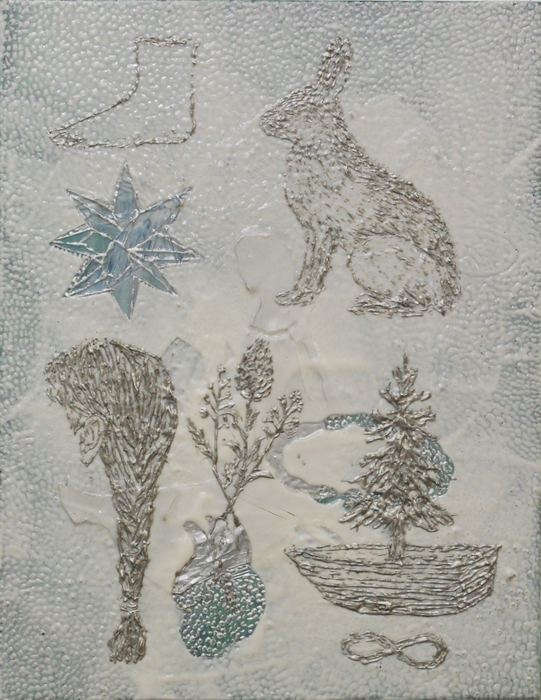 Nana Funo weaves her motifs from such as animals, people, landscapes and good luck charms that appear in stories and myths in which she has indulged since her childhood, into richly nuanced and layered, yet clear matière with a variety of touches.