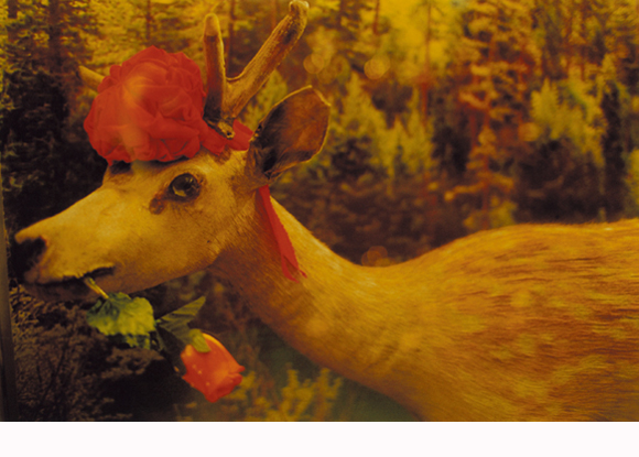 The noir series, Ninagawa’s latest group of photographs, has been shown as part of a number of solo exhibitions with the subtitle, “Earthly Flowers, Heavenly Colors.” The noir (darkness, blackness) created by this artist known for her flamboyant colors is a brilliantly colored darkness, a deepening and darkening of color. She reveals the glittering realm of life alongside the yawning abyss of death. The world of these photographs is a warped and distorted world, produced by a human hand intervening in the balance between life and death. The territory of this world is expanded and deepened, shifted toward the extreme poles of life and death, allowing viewers to experience an overwhelming, even violent, life force and a deep, distorted, garishly colored darkness.
