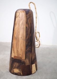 The rain tree, used as material for the floor-standing work “Refuge,” is prevalent in the tropics and provides plenty of shade, and has a distinctive grain that is wavy and eye-catching. The main structural element of the work is made from its hollowed-out trunk, with other slabs of wood carefully jig-sawed in place, transforming the tree’s appearance into something different altogether. The bamboo stems that form the other element of the work were collected from Pich’s farm in the Kirirom Mountains in southern Cambodia, and grow in incredible twists and turns due to its struggle to find light in the dense thicket. The mysterious presence of both these elements appear to resonate harmoniously with one another.