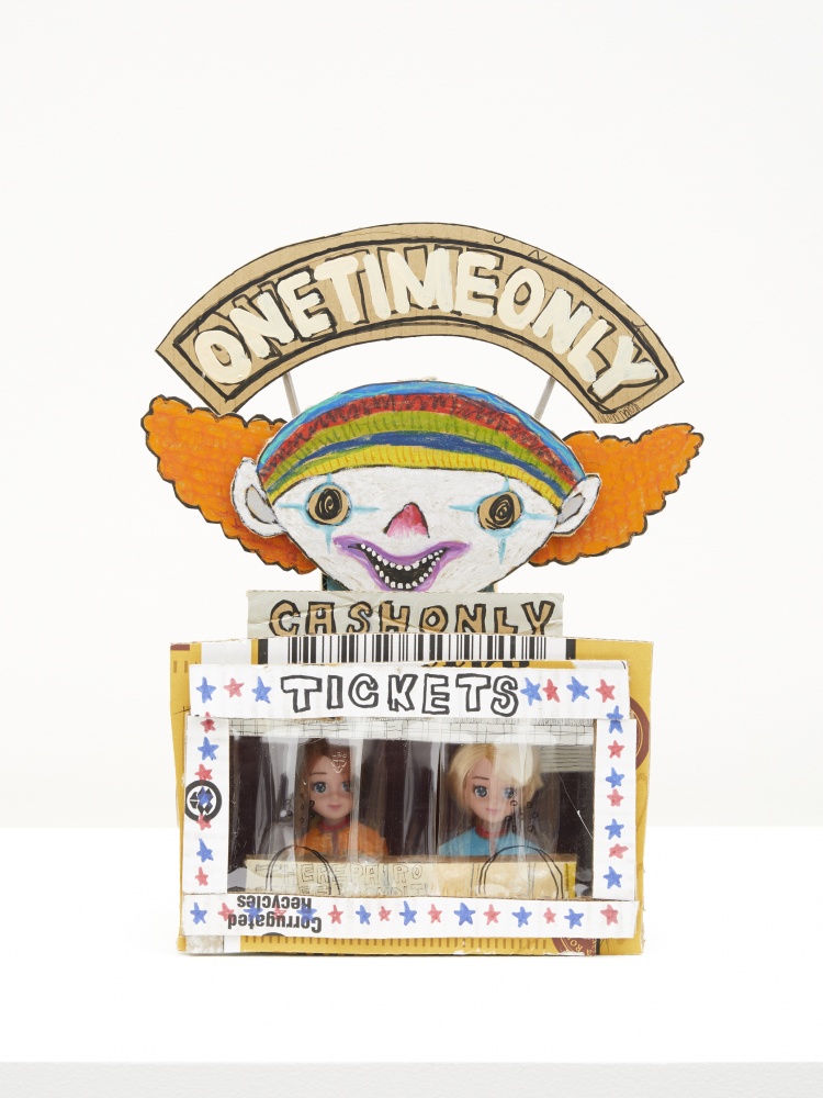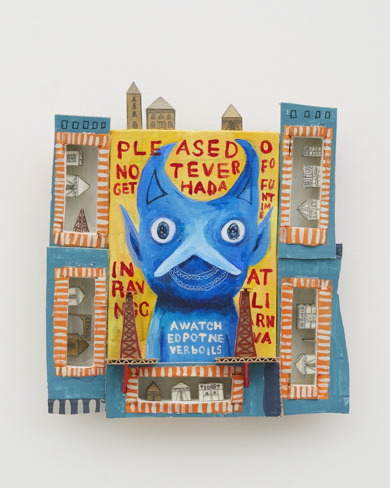 The works presented in this exhibition are based on the motif of a traveling carnival, and in addition to painting, drawing, and sculpture, as well as a combination of these techniques, features new forms of expression that include engraving patterns onto drawing frames, depicting images and text on frontal acrylic boards, and arranging cardboard and clay structures around the canvas frames of paintings. What is introduced is the liberated and intensely fascinating world of Miyake’s artistic practice in which genres of two-dimensional and three-dimensional pleasantly intermingle and coexist.