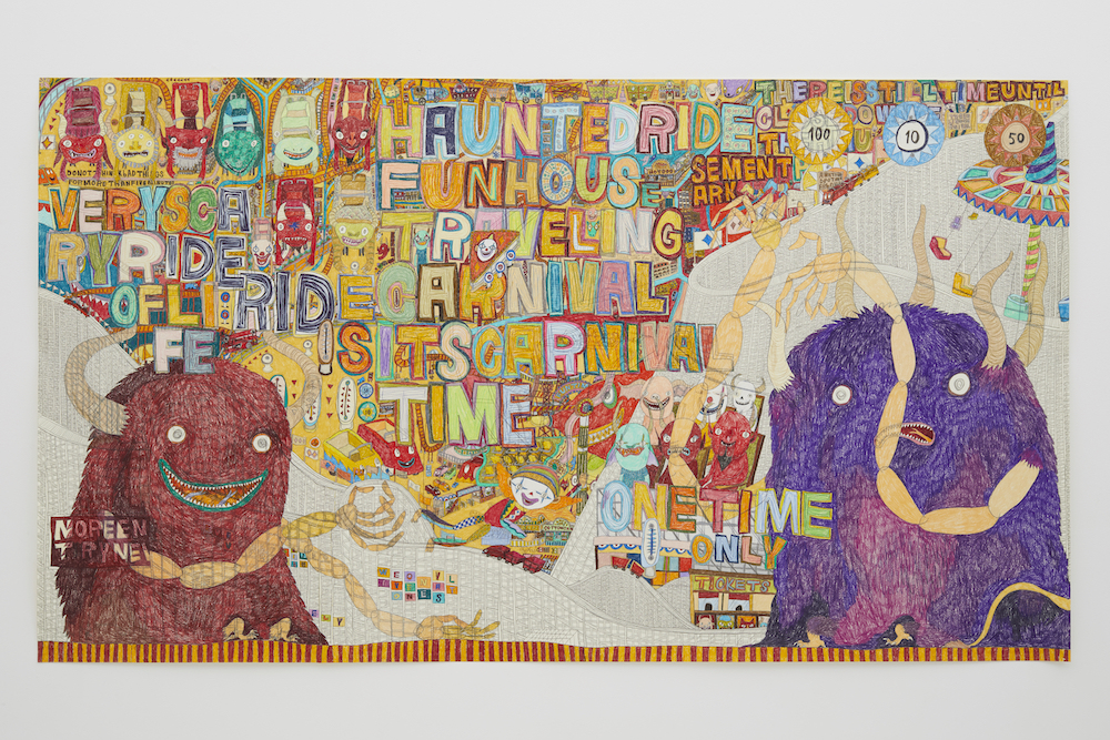 The work “FUN RIDE” depicting a roller coaster track that goes around in various different directions in the manner of an intertwining maze seems to represent the twists and turns of life. The three-dimensional track and small carts jump out beyond the frame, illustrating an air of lightheartedness that is not bound to existing frameworks, as well as the fun and merriment permeating his means of expression. Characters within the rides and haunted house are personified and can be seen enjoying the different attractions themselves, parachute rides are depicted in an overwhelming number, and strangely illustrated flying saucer-shaped vehicles continue to spin and rotate as if reflecting the very vicissitudes of life –What is presented before our eyes are various scenes of a carnival where reality and fiction coalesce, the nature of which instills much humor in viewers.
