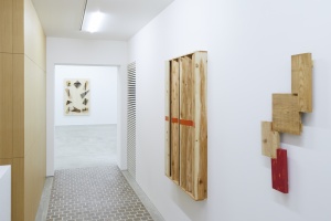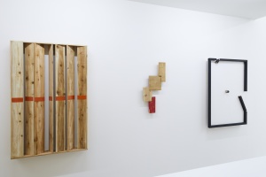 The works displayed on the walls of this exhibition “Expanded Self-Space”, for instance, are clearly an extension of Suga’s sculptures and installations. An immediate painterly interpretation of these pieces just because they hang on the wall, therefore, would be problematic. One of the reasons for this can be found in the continuity of the situation. … In each of these works, however, a single portion that protrudes outward from the white region that forms the base suggests that Suga’s awareness is not constrained to a specific framework or domain: what is alluded to here is the possibility of establishing a connection and expanding to the surrounding space.