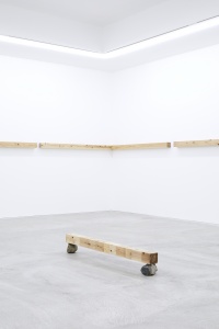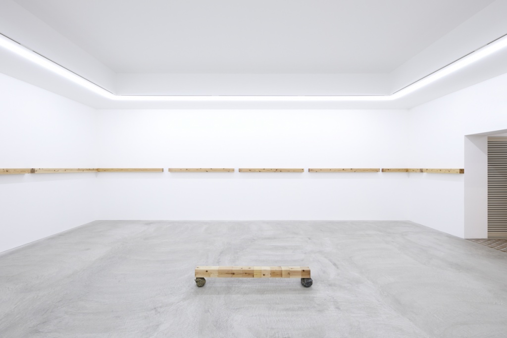 Also presented on this occasion is an installation work in which a thin piece of wood is installed across the entire wall of the back room of the gallery, with a piece of it cut out and placed in the center of the space. The work serves to represent the connection between the whole and part, as well as thing and site.