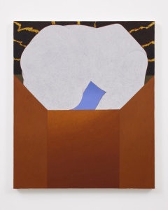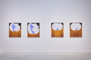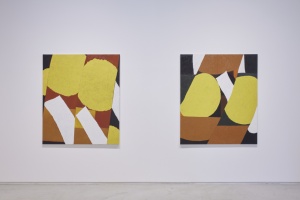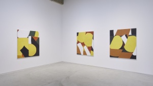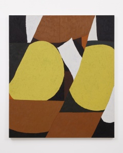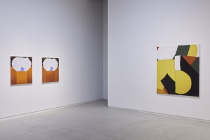 Vlahovich’s paintings are characterized by broad yellow circles and polygonal browns, greens, whites, oranges, and blues, all of which ambiguously fix and float in space.