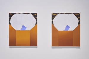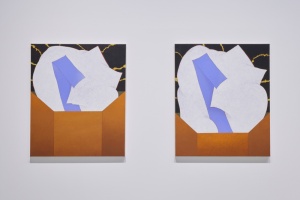 For him, the application of paint is a means of conveying a particular atmosphere and mood, while the spatial composition of the paintings hint and shift context. This exhibition features two series of works, which the artist tentatively refers to as “Bag” and “Wave.”