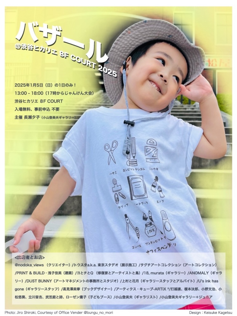 Art Bazaar 4th edition! Exciting line up of 15 Exhibitors :@nodoka_views (Creator)/Toasta a.k.a. Tokyo Studio (Handle & Install)/Taguchi Art Collection (Art Collection)/PRINT & BUILD・Yoshihide Asaco (Architect)/Yo, Chi & Q (Restorer, Artist & Bird) /18, murata (Gallery)/ANOMALY(Gallery)/DUST BUNNY(Art management office & Studio)/Kamimura & Kagetsu (Gallery staff and Part time worker)/U’s ink has gone (Gallery staff)/Mine Suda Takamizawa (Book Designer)/ARTiX ³((Gallery)/Tomio Koyama (Gallerist)/Nao Uchikoshi, Taro Enomoto, Fumiharu Ono, Yuki Komatsu, Otokichi Tachikawa, Niwa & Uta Mukasa, Yoko Rosen (Children’s booth)/TOMIO KOYAMA GALLERY+Junior. One day only, Sunday, January 5, 2025, from 1 to 6pm. A rock, paper, scissors tournament at 5pm. If you win you get awesome treasures for free! Maybe!