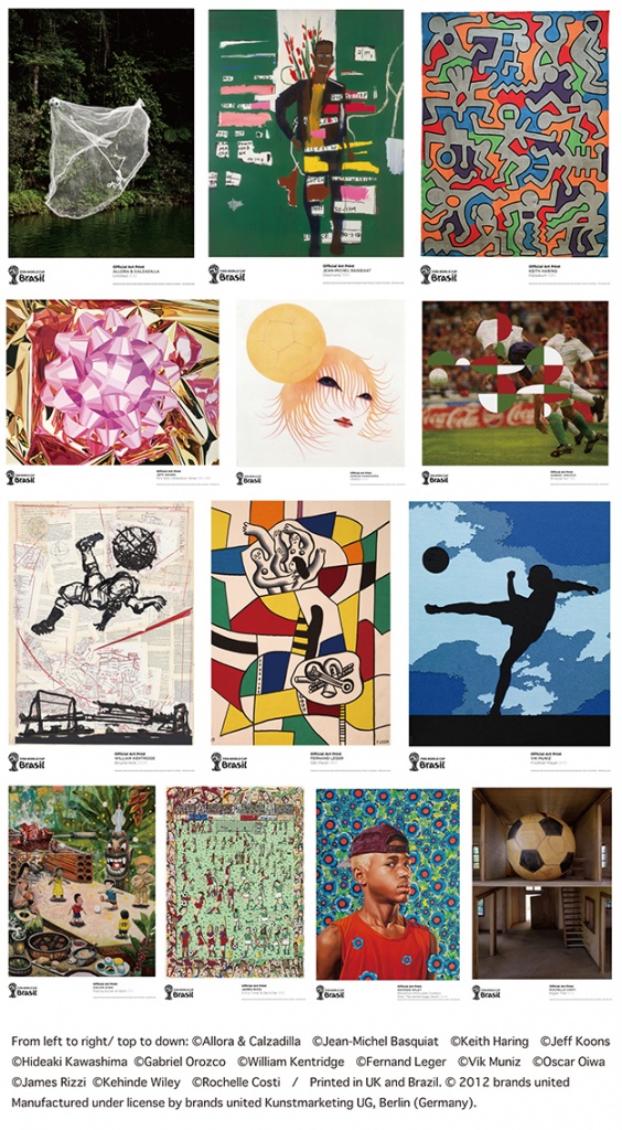 オフィシャルアートプリントエディション2014 FIFA ワールドカップ・ブラジルは、FIFAが世界中から23人のアーティストを選び、サッカーやブラジルの生活、祝祭をテーマとして制作したポスタープロジェクトです。ジャン=ミシェル・バスキア、キース・へリングといった歴史上のアーティストから、ジェフ・クーンズ、ヴィック・ムニーズ、ウィリアム・ケントリッジ、ガブリエル・オロツコまで名だたるアーティストたちと共に、日本から川島秀明、またブラジルと日本の関係が深い大岩オスカールが選ばれています。来年2014年にブラジルで開催されるFIFAワールドカップをカルチャーの面からも盛り上げるこの公式プロジェクトにおいて、小山登美夫ギャラリーでは全23点の中から、13点をセレクトした展覧会を企画いたしました。世界トップクラスのアーティストによるオフィシャルアートプリントをこの機会にぜひご覧下さい。