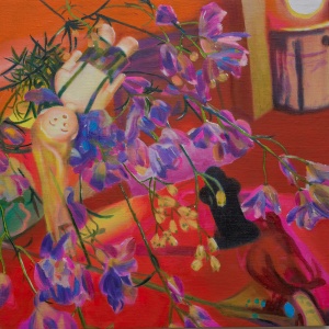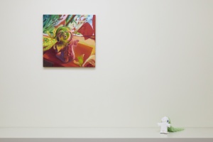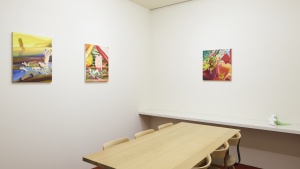 キャラクターのような存在を制作し、布、植物、おもちゃ、セロファンなどと組み合わせてジオラマを作り、何枚もの写真を撮りセレクト、それを忠実にキャンバスに描いていく。その気の遠くなるようなプロセスで作品の精度を高めていく方法は、想像を超えた驚きや楽しさを発見する実験のようであり、近年のリチャード・ゴーマンとの二人展や The Essential Store、Fujimura Familyとのコラボレーションでも、他の才能との出会いによる高揚感を生み出しています。