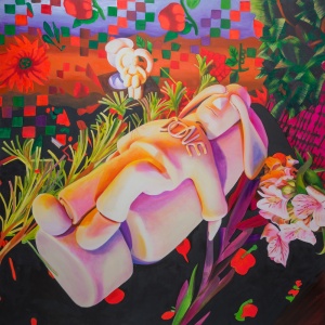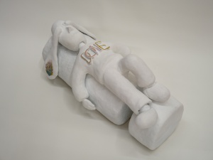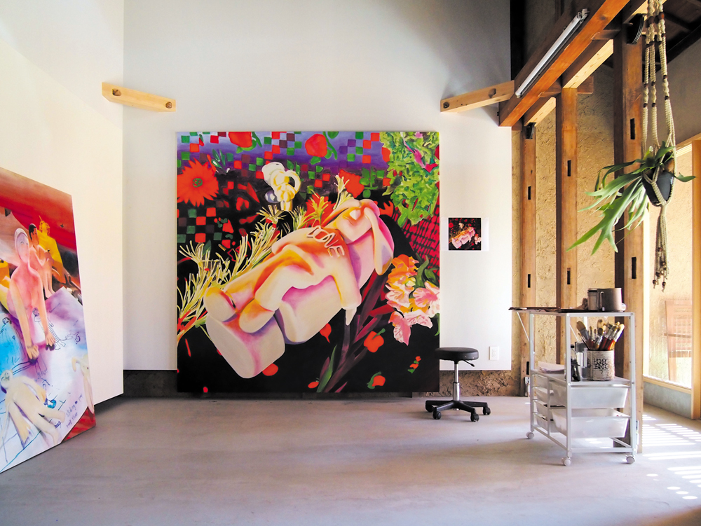 今回の出展作「I AM DONE」は、「全てをやり尽くした人」という設定の陶器で作ったキャラクターが、涙目で横たわっています。DONEはこれから活動していくための精神の休暇をとっており、その虚無の状態にある姿に反し、周りには布や花、松の葉が、生き生きとビビッドな色で配置され、不思議な世界観が227cm角の大きなキャンバスに拡大、展開されています。