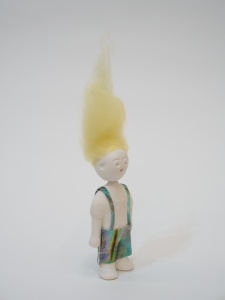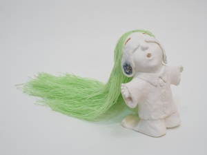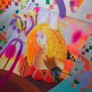 「LUCY」は毛糸の髪の毛の粘土の子で、DONEに優しく「Are you ok?」と聞いています。毛糸は風になびかせたかったけれど、水に濡らした感じも面白く変わっていきました。「I AM DONE」と対比するように明るい色彩になっており、伊藤作品としては珍しくアルミ製の布に光を反射させた背景が眩しく輝き、スプレーペインティングの線と、花の生命力が画面に活力を与えています。