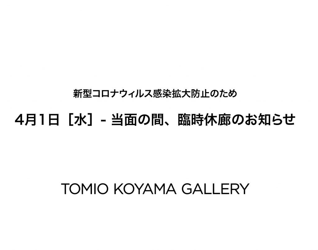 この度弊廊では、新型コロナウィルス感染拡大防止のため、小山登美夫ギャラリー(六本木)2020年4月1日[水] – 当面の間、休廊とさせていただきます。