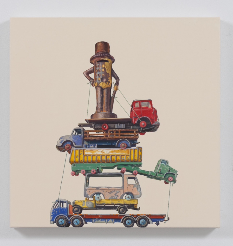 ジェレミー・ディッキンソンは1963年イギリス生まれ。1986年にゴールドスミス・カレッジを卒業、現在もロンドンを拠点に制作を行っています。ヨーロッパやアメリカ各地で個展を開催し、小山登美夫ギャラリーでは5度目の個展となります。彼は子供の頃から蒐集してきたミニカーを主なモチーフに描きます。モデルカー、トラック、路線バスやスクールバス、電車などのミニカーが子供が遊ぶように配置される様は、幼い頃の記憶を思い起こさせ、また車窓に映り込んだ風景や日差し、キズや剥落など細部の克明な描写からは作家とモチーフの共有した時間が読み取れると同時にイギリスが伝統的に持っている物への愛情、暖かさを感じられるでしょう。一方背景は常に無地で塗られ、モチーフの色彩と連動しそれを照らす光となって見る者の想像力を掻き立てます。過去の記憶を新しい想像の世界へ変化させる彼の作品をぜひご高覧下さい。