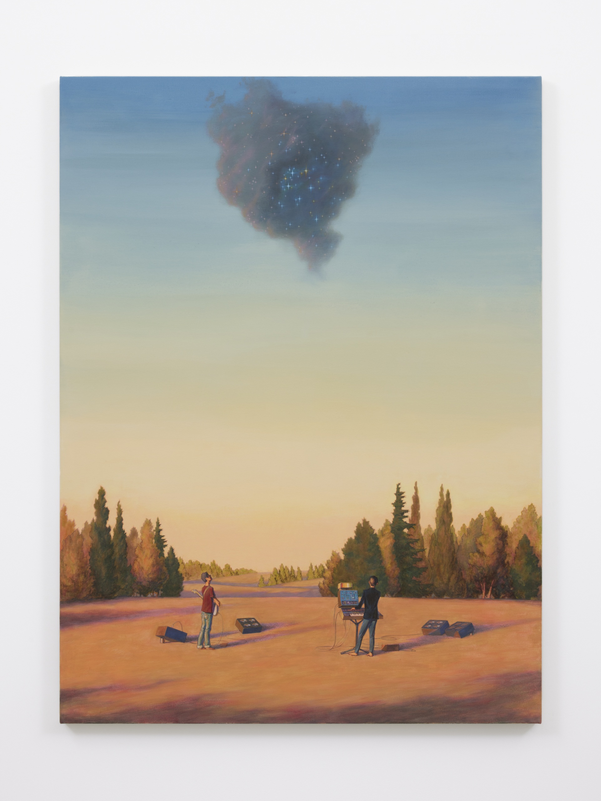 また出展作「音響気象学」では、心地よい音の集合体である音楽はなにか大きな力をもつといい、人々が音楽を演奏しながら雲のような何かを物質化している様子が現れています。