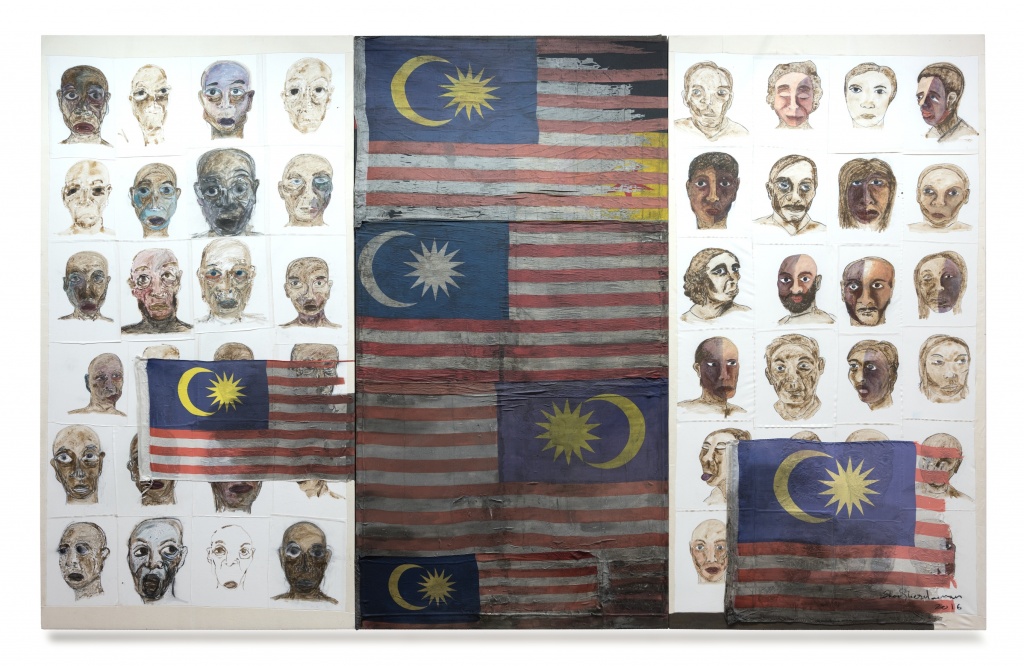 ソピアップ・ピッチ / クゥワイ・サムナン / シュシ・スライマン 「SOPHEAP PICH / KHVAY SAMNANG / SHOOSHIE SULAIMAN」 2018.7.7 [Sat.] - 8.10 [Fri.] 日月祝 小山登美夫ギャラリー - 東京都港区六本木6-5-24 complex665ビル2F OPEN:11:00-19:00 休廊日:日、月曜日 及び 祝日 入場無料 Muar 2016 soil from Muar (Malaysia), water based paint and Malaysian flags 290 x 456 cm (3 panels) ©Shooshie Sulaiman Whispering Green 囁く緑2018bamboo, rattan, wire, synthetic resin, burlap, plastics, beeswax, damar resin, charcoal, oil paint125.0 x 100.0 x 11.0 cm©Sopheap Pich Enjoy My Sand2013-2015Digital C-Print80 x 120 cm©Khvay Samnang