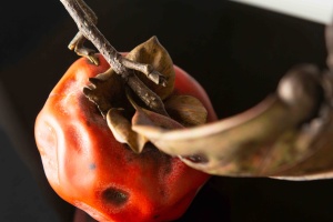 「例えば、『葉付き柿』の枯れ方をする時は、実はこの色じゃない。でも自分の思う柿の葉の色って、一瞬なんですけどこういう孔雀のような模様が出る時がある。それが僕自身の柿らしさ。だから、郷愁とか哀愁を表現したいと思って枯れてる形にしてますけど、でも本当に枯れている時はこの色ではない。」*1