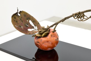 制作方法は、粘土での立体スケッチで彫り始める前に十分な時間をかけたのち、木に移行します。一つの木材から枝、葉、実と全て彫り出す「一木造り」技法を用い、日本画家の平井千香子氏にイメージを伝え何度もやり取りしながら彩色がほどこされ、制作できる限界は年に2作品。実物の柿の果実より大きいものもあったり、へたも実際の形や色とは異なっていますが、岩崎の中にある「柿の概念」がそこに映し出され、本質に迫る力強い写実性、時間性、そしてそれらを超えた深い作家性をも醸し出されています。