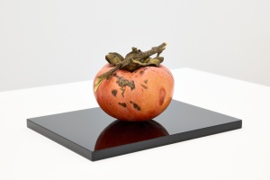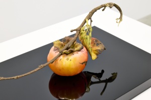 「柿」をモチーフとした作品「嘉来」は、一見木彫とは思えない驚くほど繊細でリアルな表現ですが、岩崎にとっては心象風景を形にしたものであると言います。故郷の井波には柿の木がいっぱいあるが、実がなっても誰も取らずに深いオレンジ色になり、雪が積もり、朽ち果て、下に落ちる。それが作家にとっての原風景であり、郷愁からはじまった作品となっています。