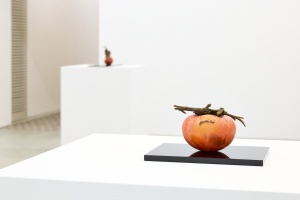 サイズも実際の柿より少し大きいものもあり、木で柿を作ることによる作家自身のリアルな物象や「物体としての柿」の再現を彫刻として表しているようです。