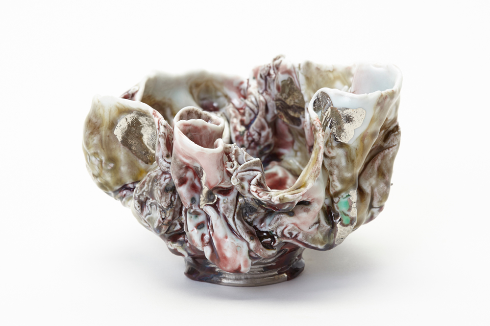 川端健太郎の、磁土の手捻りによる独特な造形のオブジェは、深海の生物のような神秘的な生命感を帯びています。岐阜県瑞浪市の自然豊かな環境に工房を構える川端にインスピレーションを与えるのは、愛猫が口にくわえてきた虫や、多くの人は見逃してしまうような、かすかな、あるいは当たり前の季節の変化などです。春に芽吹き、夏に茂り、秋に実り、冬に枯れる。その生命の振幅をドラマチックに膨らませ、繊細な指先で紡ぐように生み出されるかたちに、混ぜ込んだガラス片や、硫化させた銀が与える多彩な釉調は、艶やかな色気を放ちます。