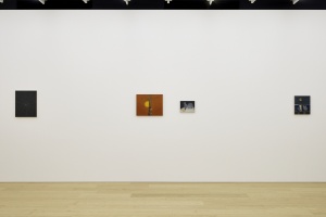 もう一点の新作「よるのきのなか」は、近所の雑木林の絵で、当初は明るい昼間の林を歩く2人の人物を描こうとしていたのが、制作しているうちに夜の林へと変化し、3人の人物が現れたと言います。作家自身、最初は瞬間的なイメージや言葉を手がかりに進めますが、なぜそれを描くのかは制作を進めながら、または完成した後で気づくと言い、作品自体が自己認識の装置であり、思考の軌跡や時間を内包したものとなっています。