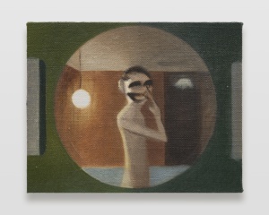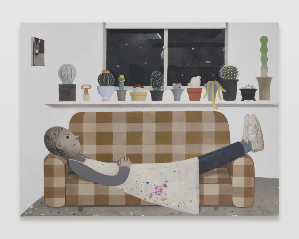 新作「あさをまつよる」は、アトリエで横になっている自画像であり、背景にある多肉植物は実際に育てているもの、画中画は以前の自身の作品です。「待つ」という行為に希望やなんらかの想いもなく、ただ「待つ」という状態の特殊性と重要さ。前回の個展から2年間の社会の変化も大きく、作品制作が難しく感じることもあったという状況も関連しています。